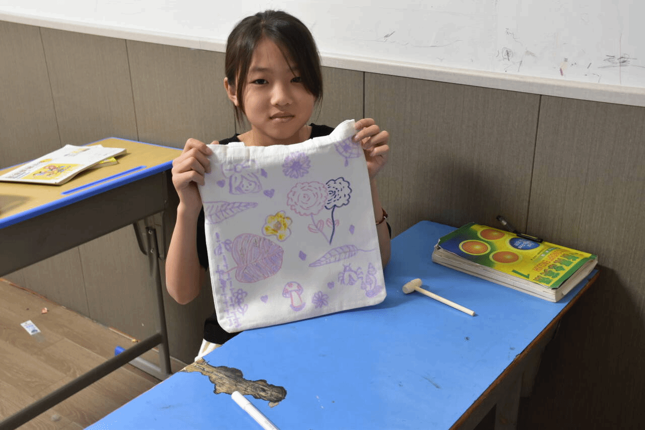 清晨8点50分,志愿者们提前抵达活动现场,分组采集梧桐、枫树、银杏等本地植物叶片,并对采集的植物进行安全分类与清洁处理。活动中,志愿者引导孩子们近距离观察叶片的脉络纹理,四年级学生王梓涵在触摸梧桐叶后感叹:“原来每片叶子都有自己的指纹”,上午的植物认知环节特别设置了安全科普,筛选出5大类无毒无害的植物标本,为后续创作筑牢安全基础。下午的拓印环节充满欢声笑语,木槌敲击叶片的“咚咚”声此起彼伏。志愿者陈雨萱现场演示拓印技巧,指导孩子们用棉布包裹叶片,通过均匀敲击将植物色素转移到帆布包上。二年级学生李想将枫叶与三色堇组合成蝴蝶造型,叶片天然的轮廓与色彩在帆布包上交织出充满童趣的画面,引得周围同伴连连称赞。活动最终收集83件创意作品,其中12件优秀作品将被用于社区环保展览。