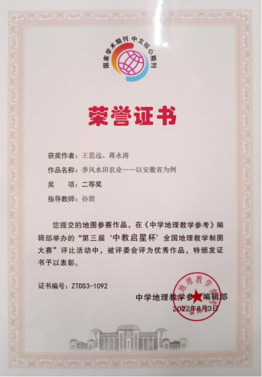 “中教启星杯”全国地理教学制图大赛是面向中高等学校教师和教育师范生的创新性比赛。由陕西师范大学出版总社《中学地理教学参考》编辑部主办、北京中教启星科技股份有限公司协办的第三届“中教启星杯”经5月1日—6月30日报名及作品提交、7月1日—30日评委评审,近日公布了获奖名单。环测学院2019级地理科学2班王思远同学设计的《季风水田农业—以安徽省为例》系列组图荣获本次大赛二等奖,指导老师孙朋副教授获“优秀指导教师奖”。