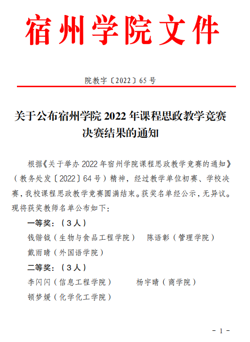 为深入贯彻落实习近平总书记关于“大思政课”的重要指示批示和在中国人民大学考察时的重要讲话精神,全面贯彻落实教育部《高等学校课程思政建设指导纲要》,深入落实《中共宿州学院委员会关于“课程思政”建设的实施意见(试行)》,我院教师积极报名参加宿州学院2022年课程思政教学竞赛。