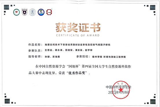 近日,我院19级地理科学专业学生王思远及其团队参加中国自然资源学会“国地杯”第四届全国大学生自然资源科技作品大赛,在导师孙朋副教授和苏海民副教授的共同指导下获“优秀作品奖”。本届大赛由中国自然资源学会主办,中国自然资源学会教育工作委员会、内蒙古财经大学资源与环境经济学院、南京大学地理与海洋科学学院、广东国地规划科技股份有限公司、内蒙古自然资源学会承办,内蒙古自然博物馆、内蒙古师范大学地理科学学院、自然资源部碳中和与国土空间优化重点实验室、《干旱区资源与环境》编辑部协办的中国自然资源学会“国地杯”第四届大学生自然资源科技作品大赛得到了全国各地高校的积极响应,共收到有效作品181份。大赛组委会在对相关作品进行了形式审查的基础上,专门组织了由11位专家组成的专家组对作品进行集中评审。经过层层遴选、优中选优,最终确定38项作品授予优秀作品奖。